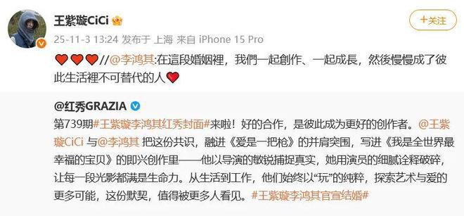 感觉就是八竿子也打不着的两个人,居然闷声儿地官宣了:“在这段婚姻里,我们一起创作、一起成长,然后慢慢成了彼此生活里不可替代的人。”
